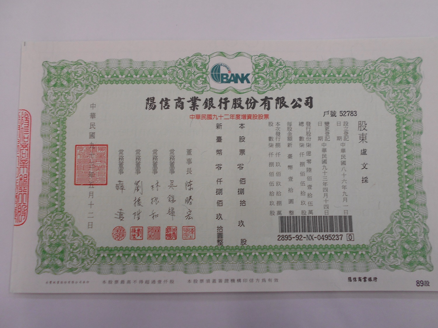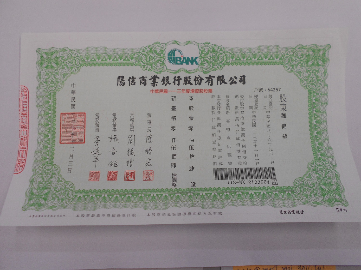 拍賣陽信商業銀行股份有限公司股票1張54股 |