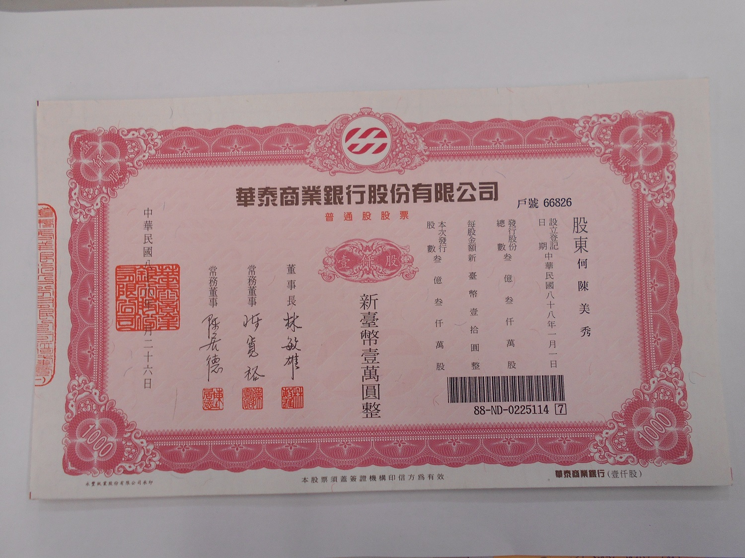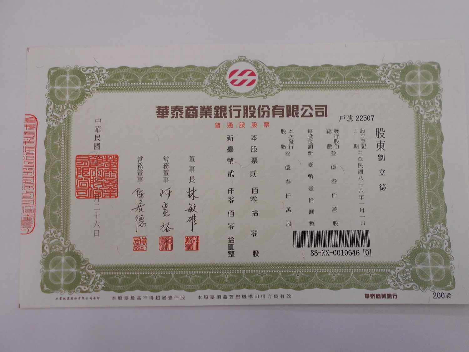 拍賣華泰商業銀行股份有限公司股票20張1921股 |