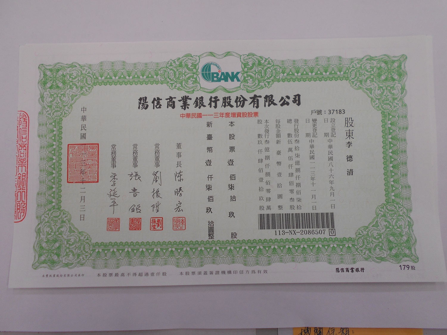 拍賣陽信商業銀行股份有限公司股票15張1200股 |