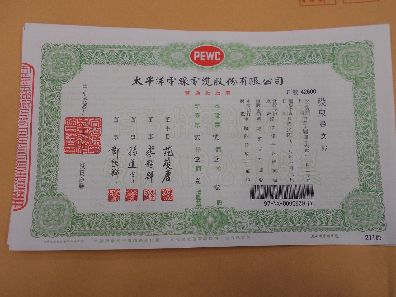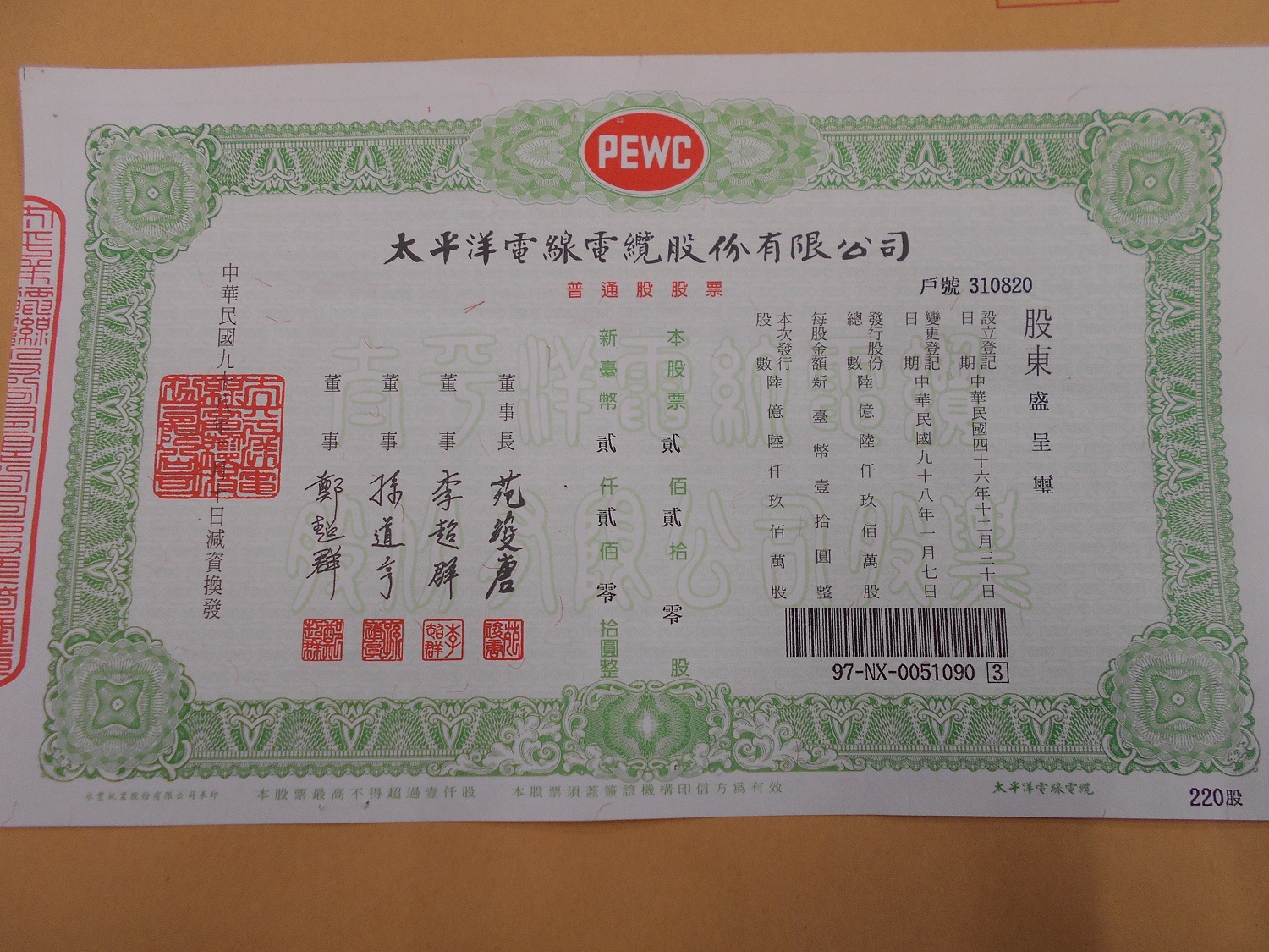 拍賣太平洋電線電纜股份有限公司股票1張220股 |